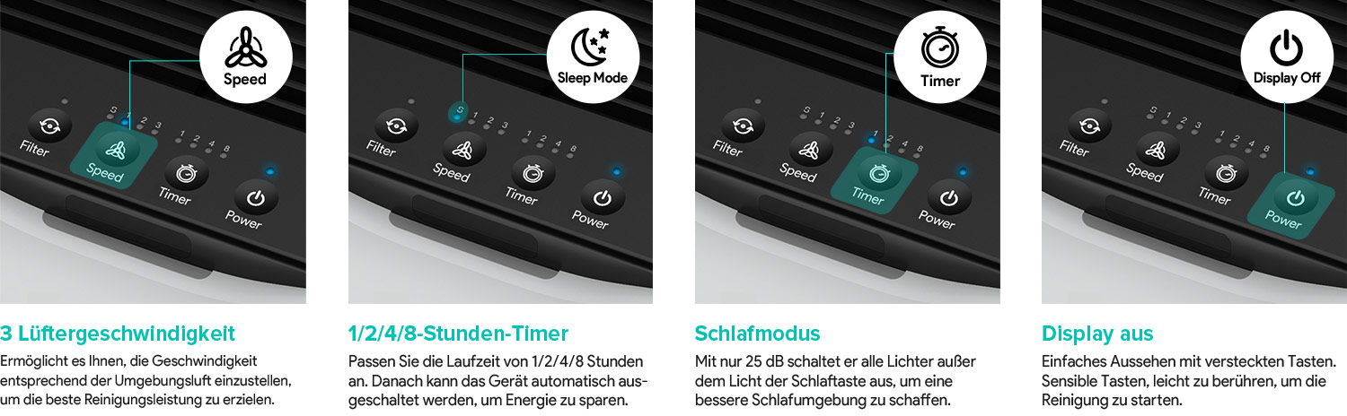 [Multi-Funktion] 3 Lüftergeschwindigkeit (niedrig/mittel/hoch) und 1/2/4/8 Stunden Timer- Funktionen erzielen die beste Reinigungsleistung und sparen dabei die Energie.