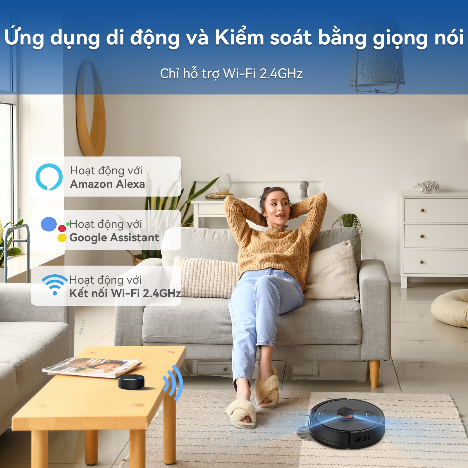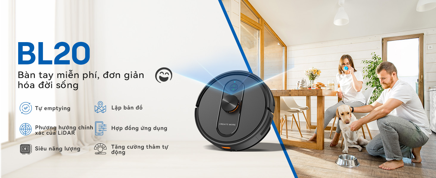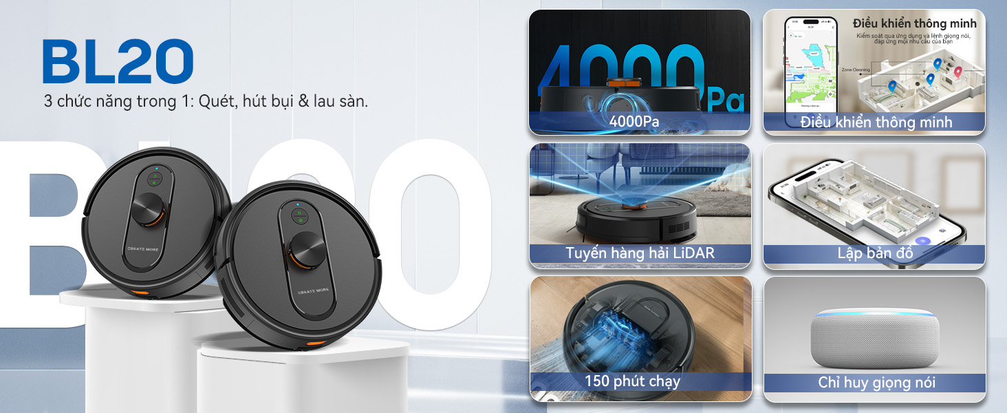 Sức hút mạnh 3500Pa–6000Pa, thiết kế siêu mỏng chỉ 2.7 inch, giúp dễ dàng len lỏi dưới ghế và gầm tủ. Hoạt động siêu êm, tự động sạc, đi kèm dải giới hạn khu vực. Phù hợp với mọi bề mặt: sàn gỗ, thảm, gạch, và đặc biệt dọn sạch lông thú cưng hiệu quả.