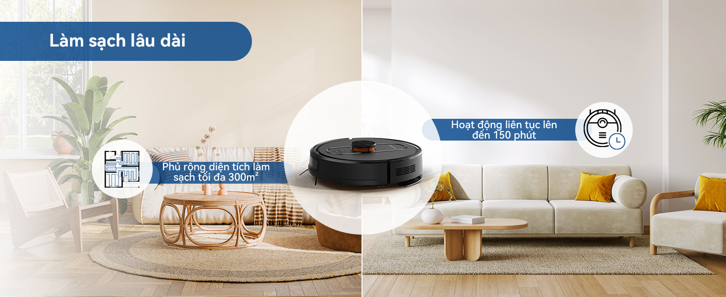 Hoạt động lâu dài & tiện lợi: Thời gian sử dụng 100 phút, tự động quay về đế sạc khi pin yếu.