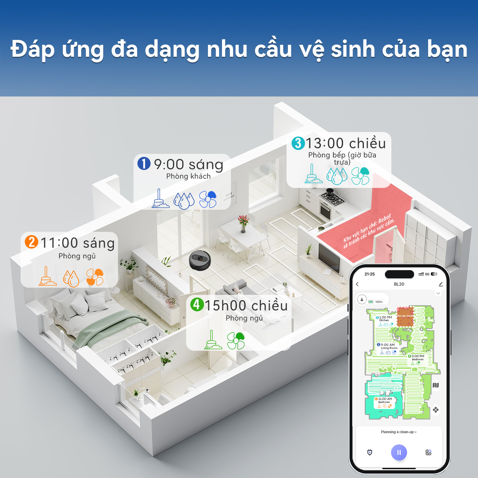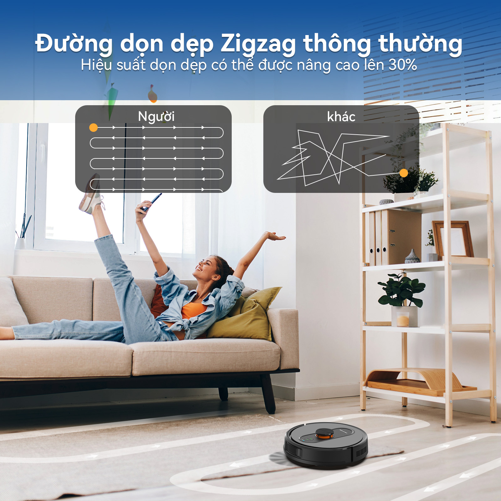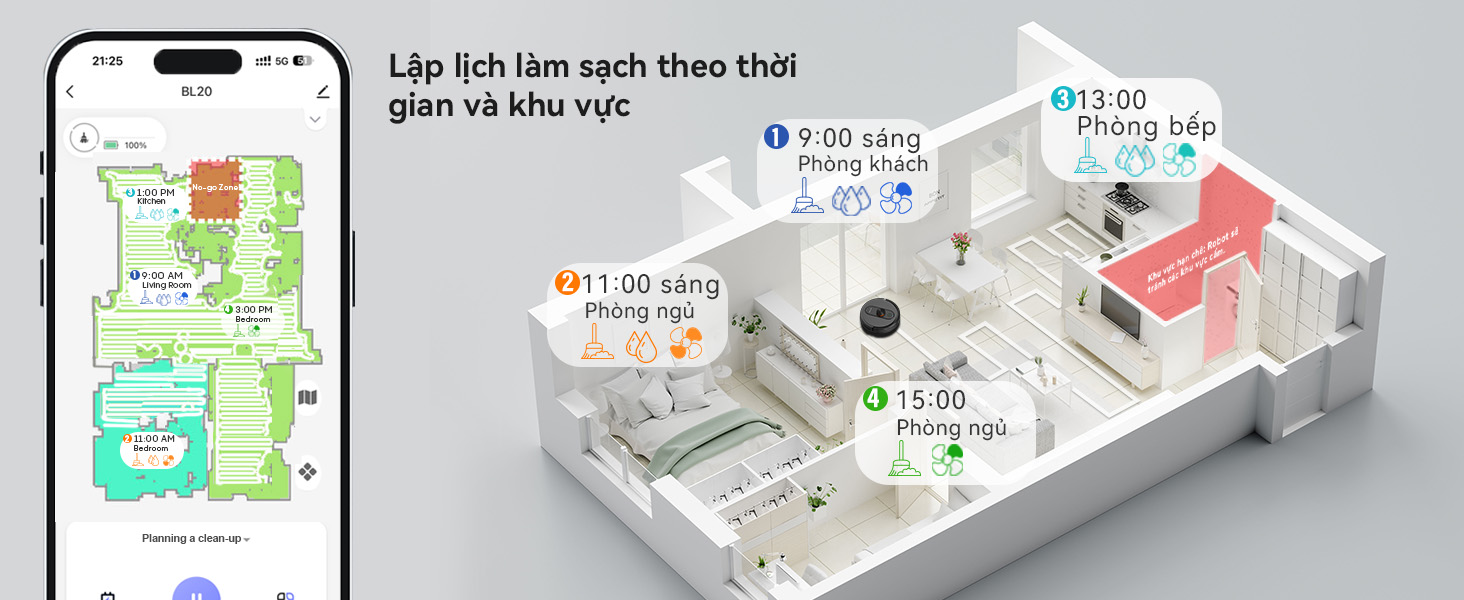 Điều hướng thông minh: 6 chế độ làm sạch linh hoạt, phù hợp mọi khu vực.
