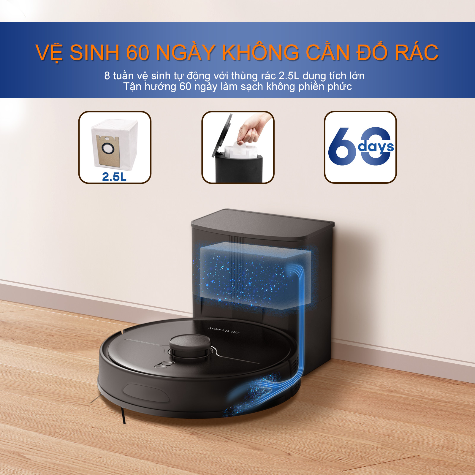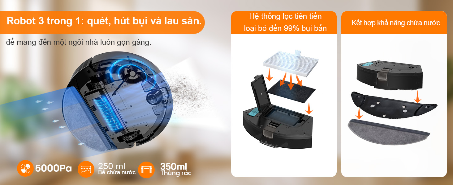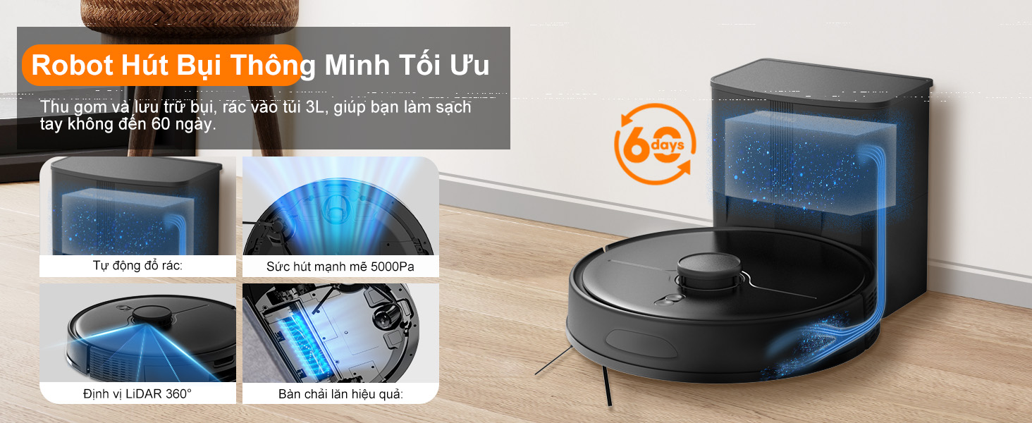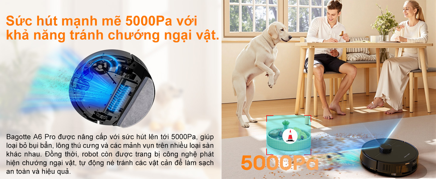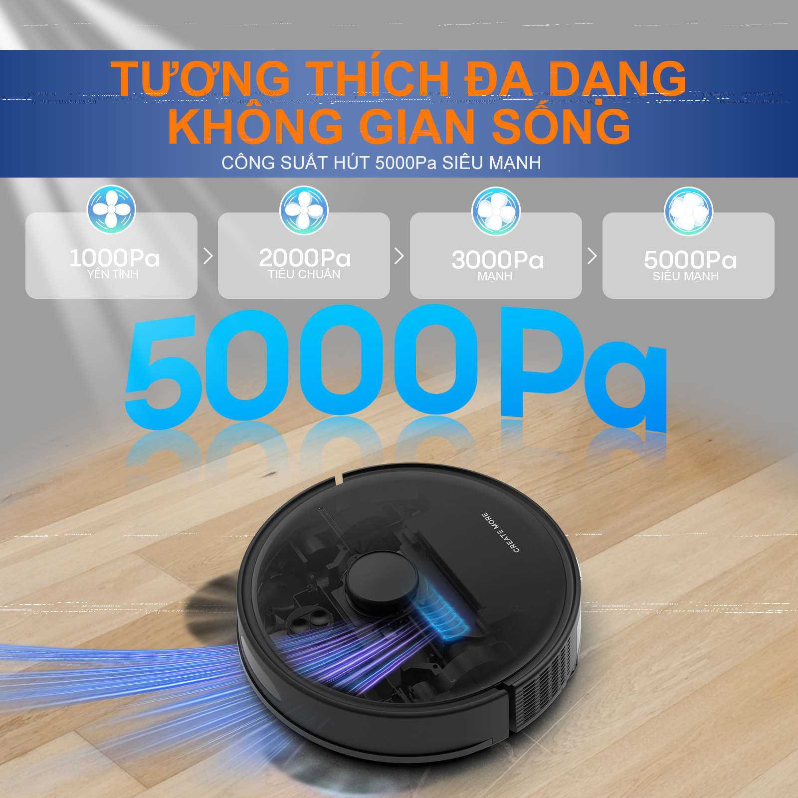 Sức hút 5000Pa mạnh mẽ: Loại bỏ mọi bụi bẩn và rác hiệu quả.