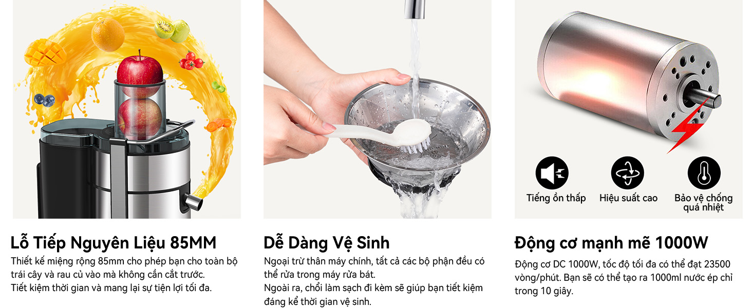 Với lỗ tiếp nguyên liệu rộng 85mm, cùng công suất mạnh 1000W, máy cho phép bạn sản xuất 1000ml nước ép chỉ trong 20 giây.
