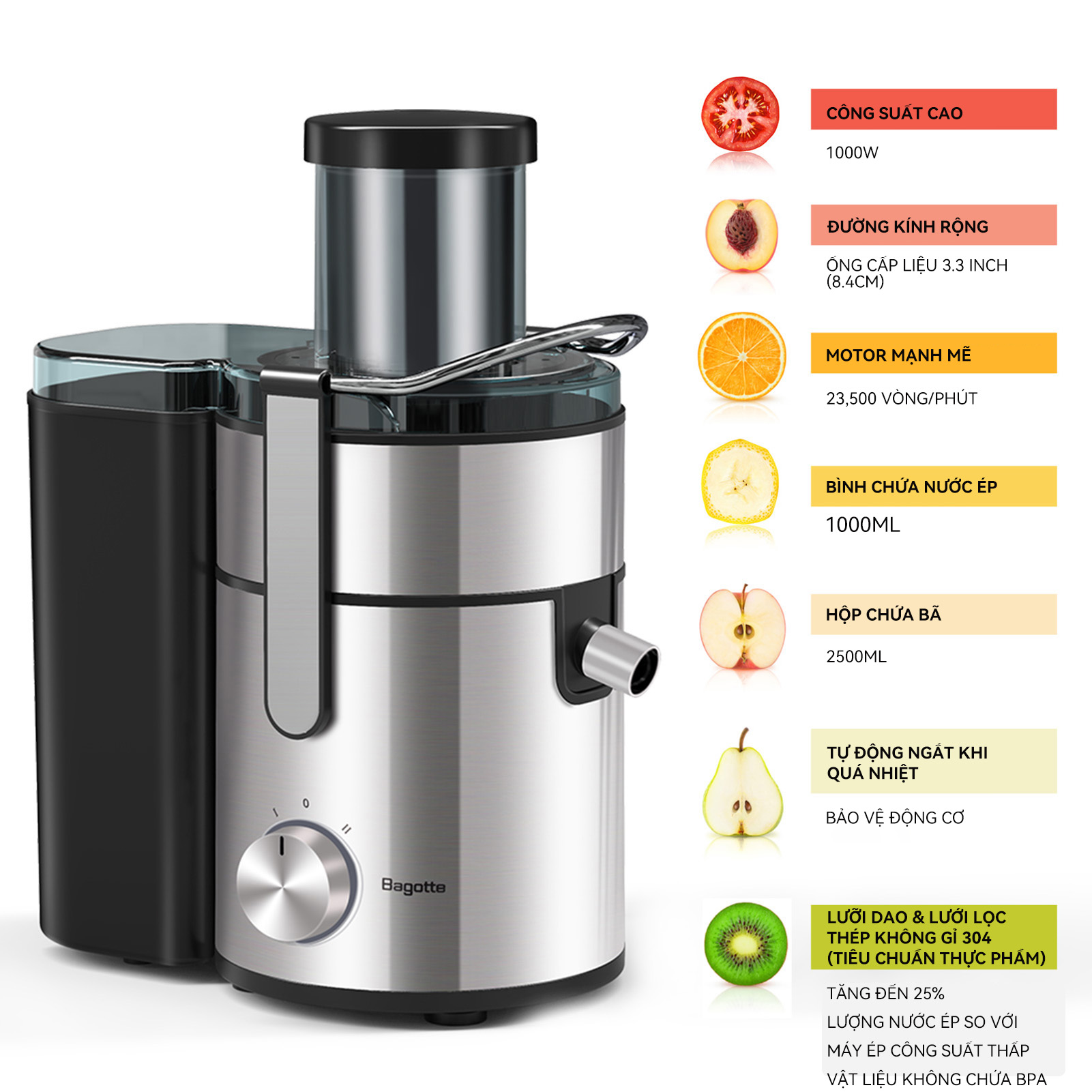 Công suất: Máy ép nước ly tâm mạnh mẽ 1000W