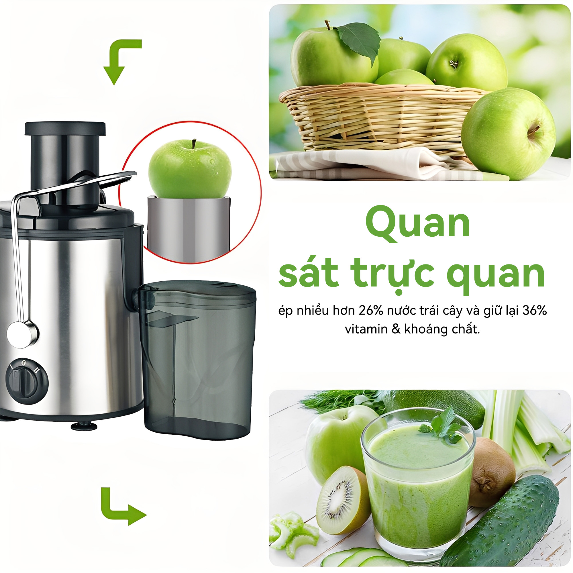 2 tốc độ ép, phù hợp cho trái cây hoặc rau củ