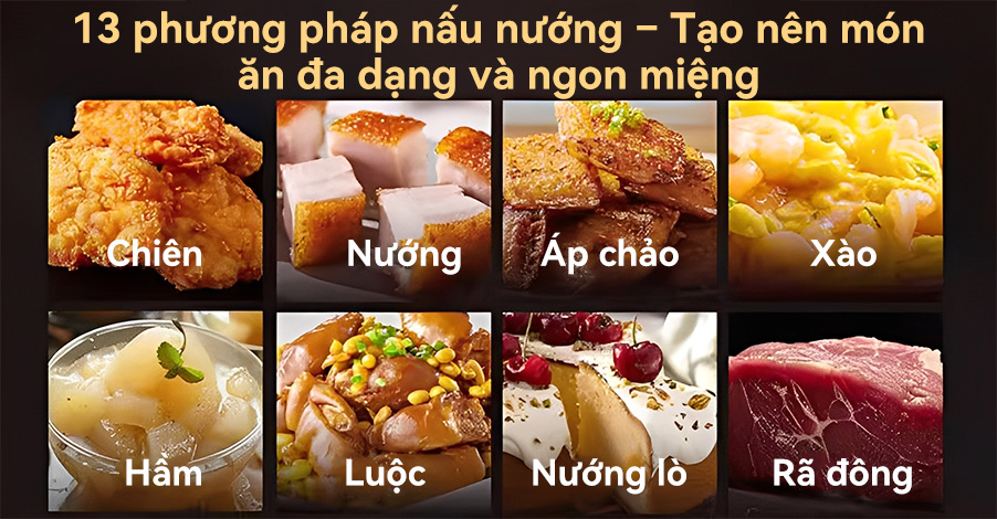 6 chế độ cài đặt sẵn: Khoai tây chiên, Cánh gà, Bò bít tết, Thịt xông khói, Tôm, Bánh ngọt