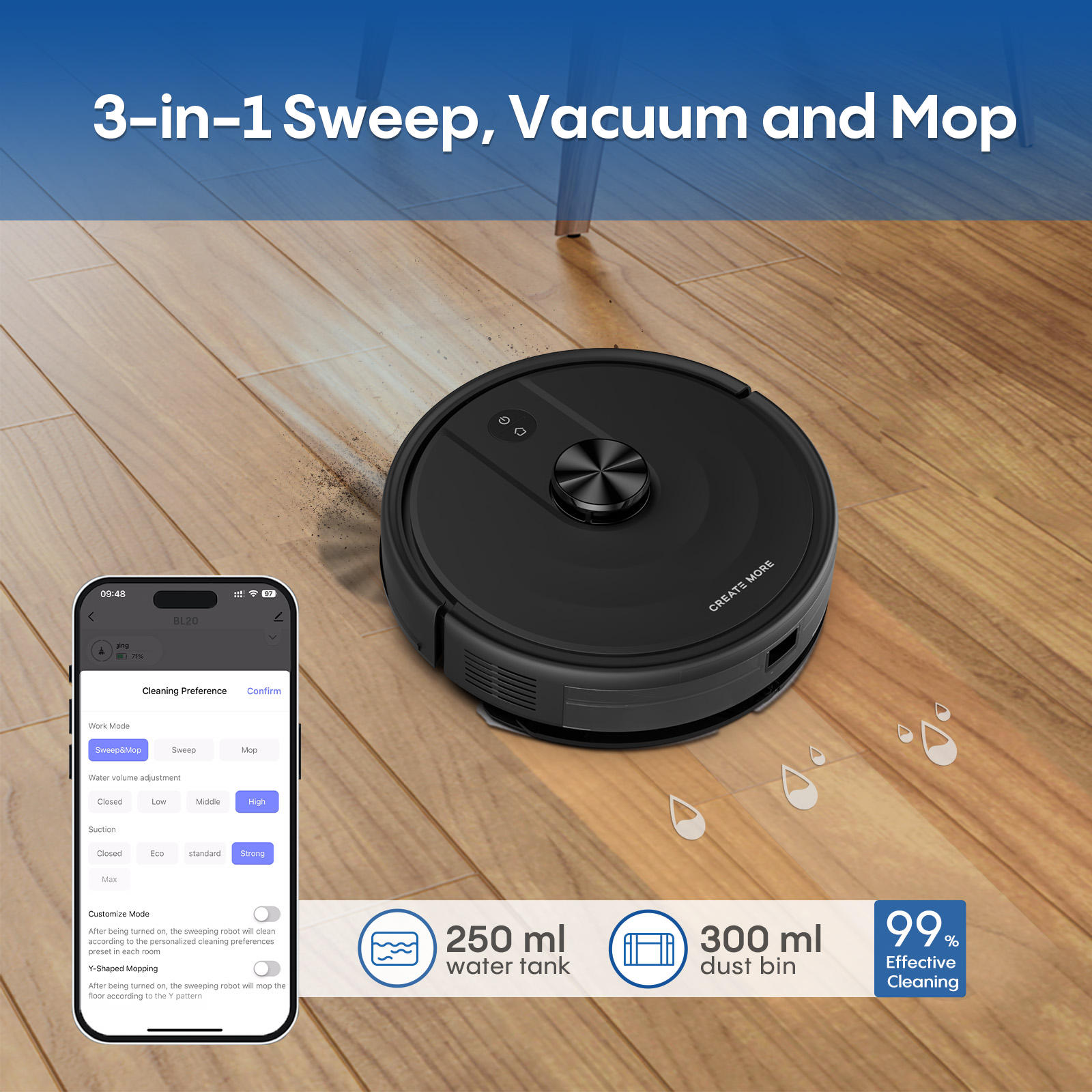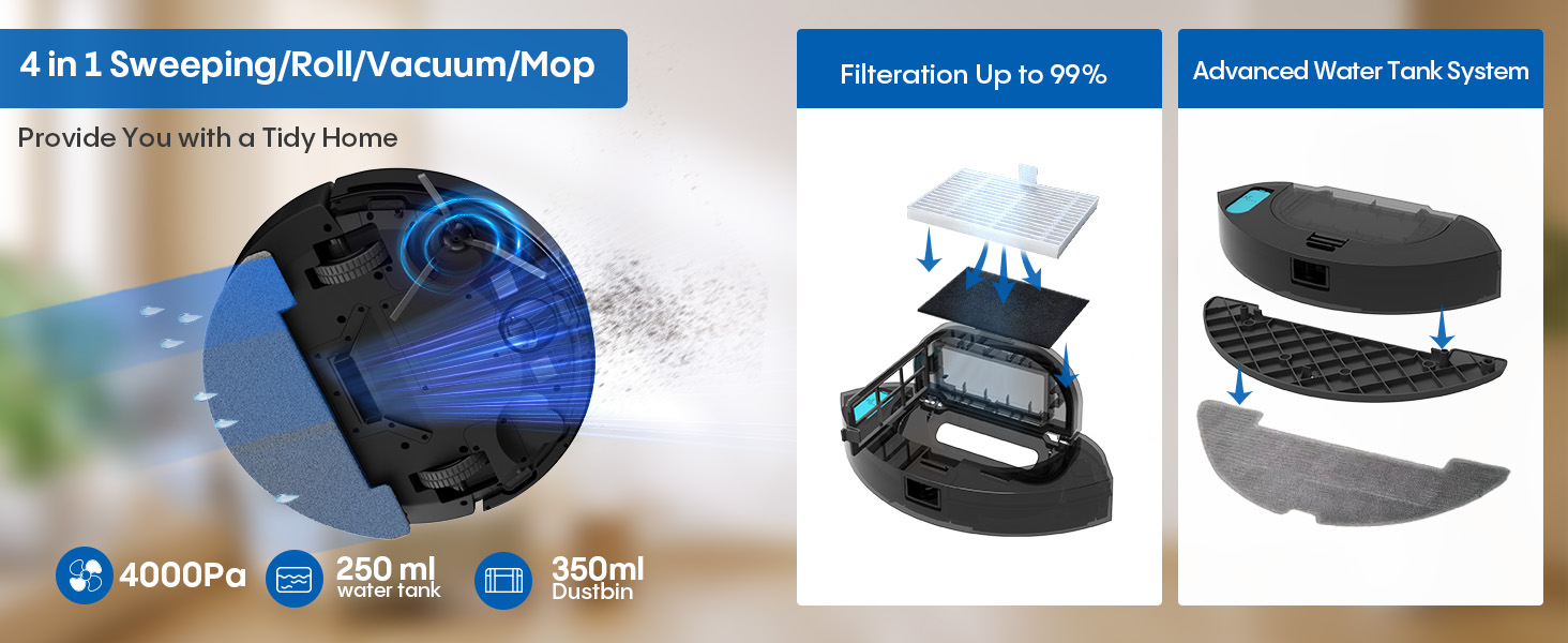 Sweep,Vacuum and Mop 3-in-1 This all-in-one robot effortlessly tackles vacuuming, sweeping, and mopping all at once, delivering a complete clean for both wet and dry conditions. Designed to adapt to diverse needs, it streamlines your daily routine, saving you valuable time and effort.