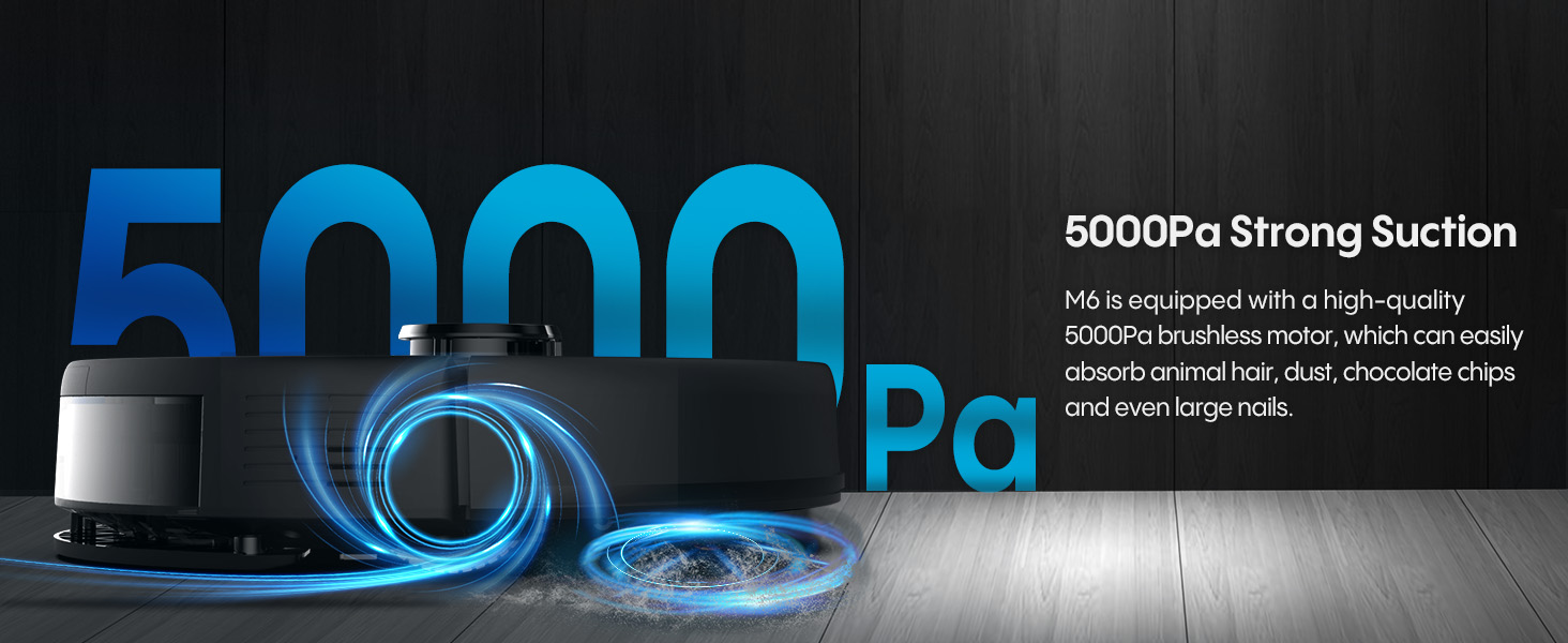 Powerful 5000Pa Suction This robot vacuum and mop combines a high-quality 5000Pa roller brush, offering 30% higher cleaning efficiency than brushless motors. It easily removes pet hair, dust, chocolate crumbs, and even larger debris like nails. It integrates vacuuming, mopping, and dehumidifying, and features a 230ml water tank for easier and more convenient floor cleaning. This robot vacuum and mop is ideal for pet-owning families or households with high foot traffic.
