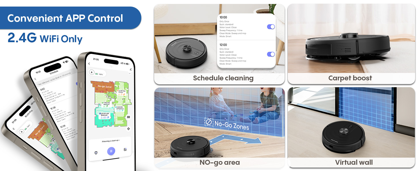 Smart App & Voice Control Complete Management Control this robot vacuum and mop combo via 2.4G WiFi app, Alexa, or Google Assistant. Schedule cleanings, adjust suction power, switch between vacuuming and mopping modes, and monitor cleaning progress remotely with this intelligent automatic vacuum cleaner. Give the gift of a cleaner home and more free time.